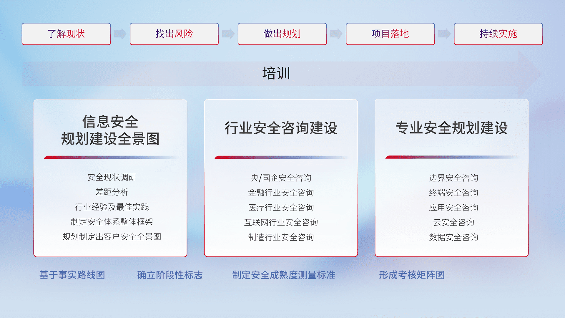 梳理客户信息安全现状调研、、差距分析结果,,,,结合行业先进经验及最佳实践,,,制订客户的信息安全管控体系总结架构,,,,最终形成一个完整的客户信息安全规划与建设的全景图。。