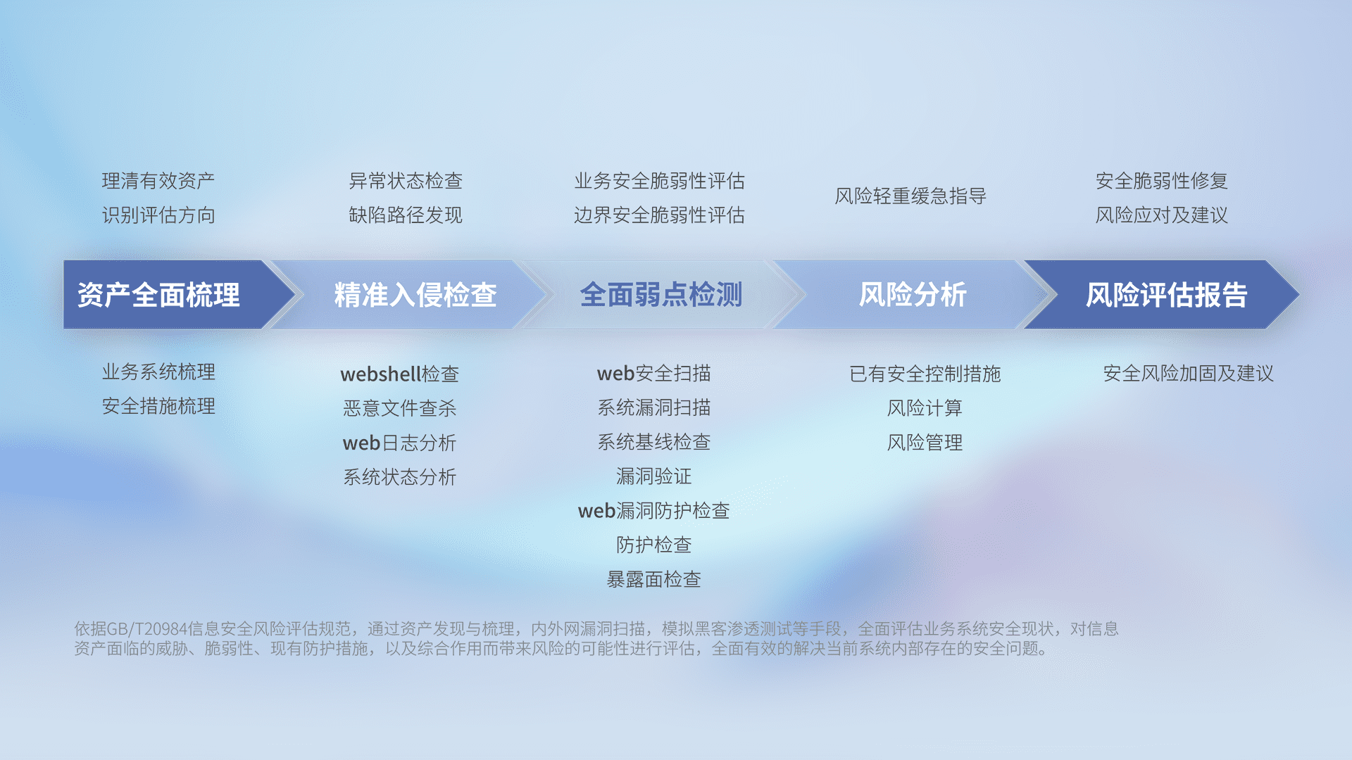 针对客户行业特性,,以专业的安全服务+多厂商联合解决方案提供专属的一站式安全管理服务,,,帮助客户全面感知网络空间威胁,,基于识别、、、检测、、、、分析、、防护、、监测、、、、响应的服务理论模型,,,,从方案咨询、、、、集成交付、、评估验证、、、优化加固、、、、运维运营,,,,致力于为客户提供完整的闭环管理式安全服务。。。。以实战经验为客户打造高抵御风险的安全体系,,,,帮助客户发现威胁、、、对抗威胁、、、、处置威胁,,不断积累安全对抗能力,,,,持续保障数字化安全。。。。